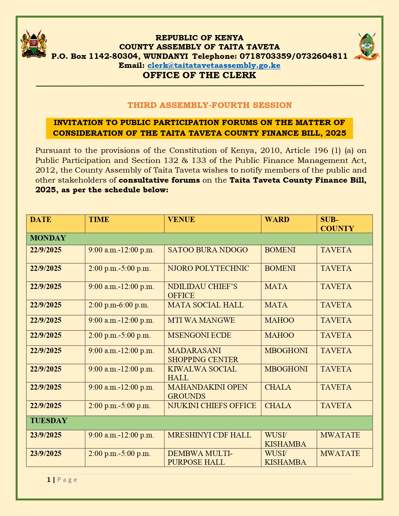 INVITATION TO PUBLIC PARTICIPATION FORUMS ON THE MATTER OF CONSIDERATION OF THE TAITA TAVETA COUNTY FINANCE BILL 2025